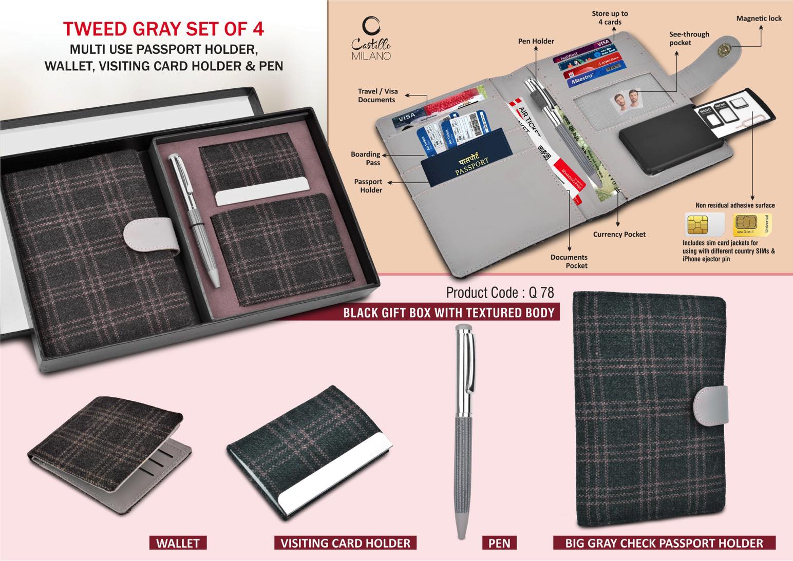 Tweed Gray Set of 4- Multi use Passport holder, Wallet, Card holder, Metal Pen