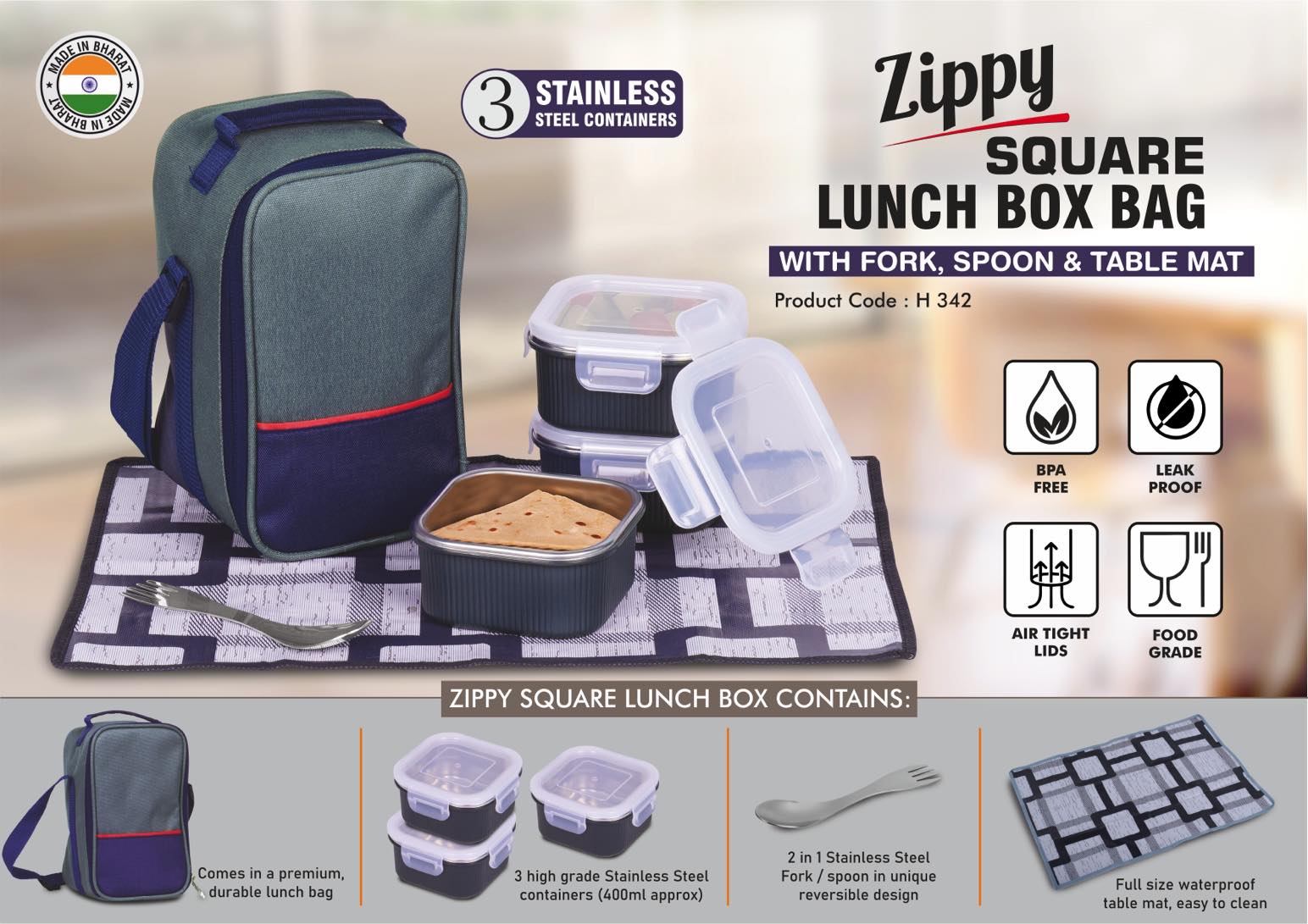 Zippy Square- Lunch box bag with 3 Square Stainless steel containers with striped design, Fork, Spoon, Tablemat
